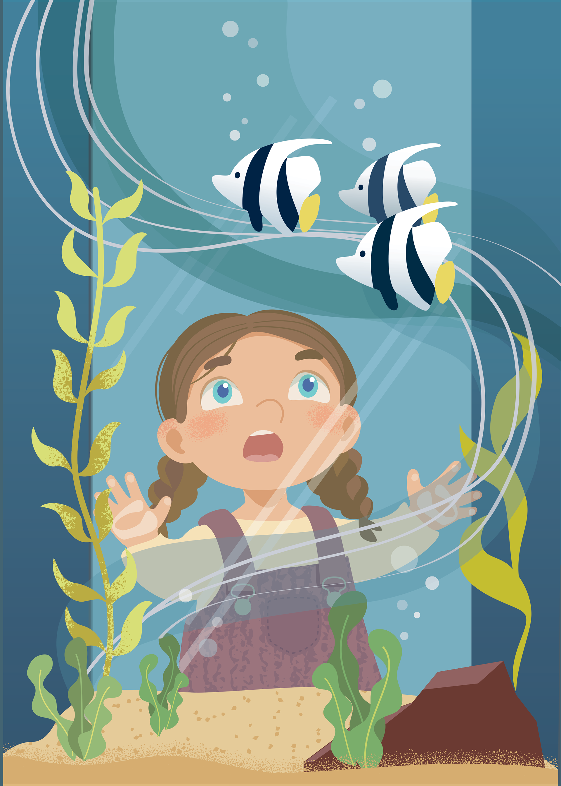 This illustration was created with Adobe Illustrator! Aquariums have always been one of my favorite places to visit, and I loved trying to capture some of that "wonder" in this little girl.